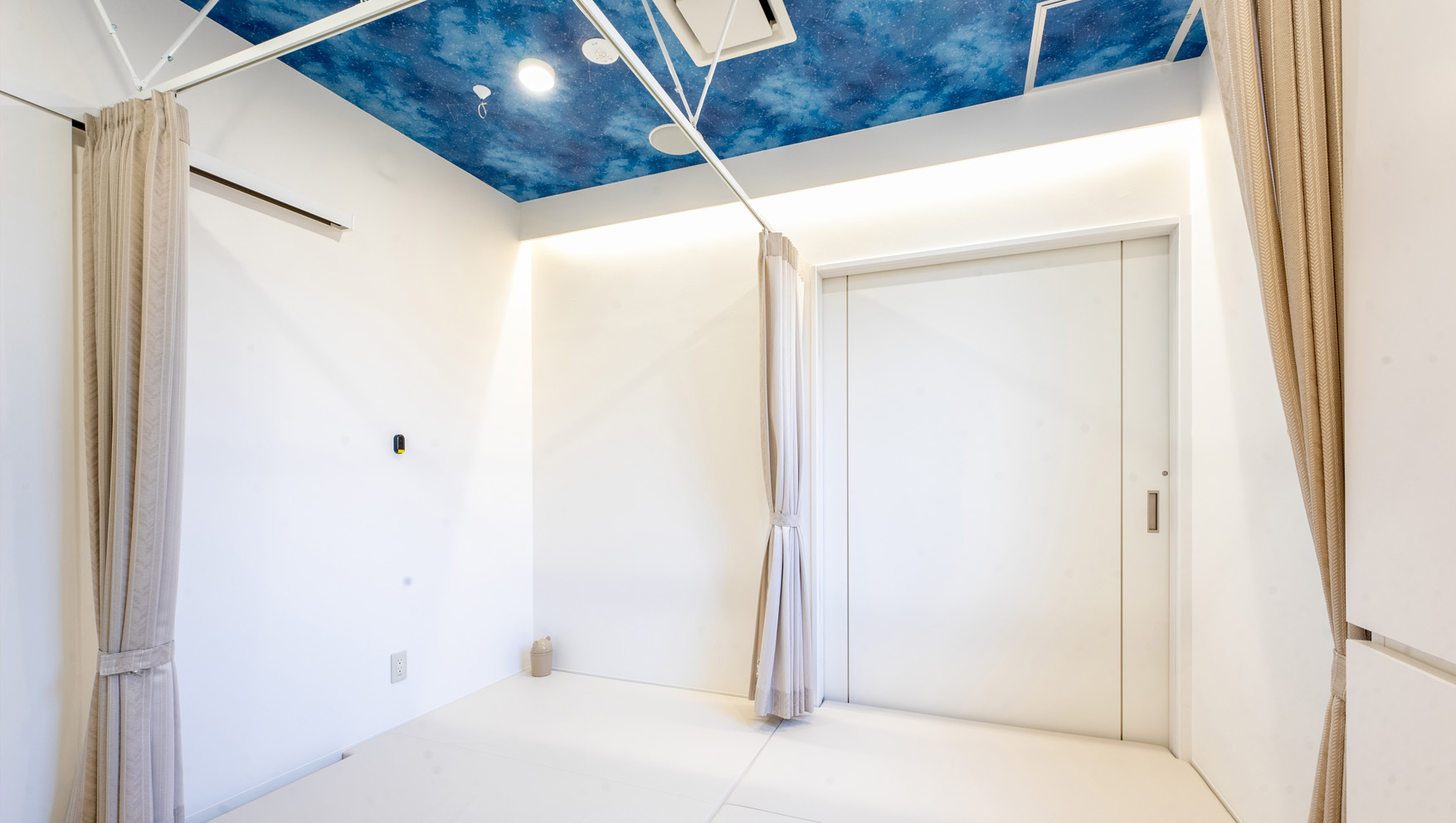 体調のすぐれない小さなお子さまが、保護者の方と安心して過ごせるよう配慮しています。 お連れのお子さまも一緒に過ごしやすいよう、クッション性のあるマットの上で点滴を行います。 天井には星空をイメージした装飾を施し、少しでも気持ちが和らぐよう工夫しています。